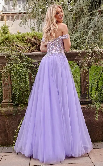 Bring the glamour—the applause will follow—in Jovani dress 23963 that can't glitter anymore and can't wow any less! This fabulous gown features an off the shoulder sweetheart neckline and cap sleeves. Sparkling AB crystal stones encrust the fitted elongated bodice and tumble on to the chiffon A-line skirt. Be ready for all the compliments! Give us a call at Henri's for more details