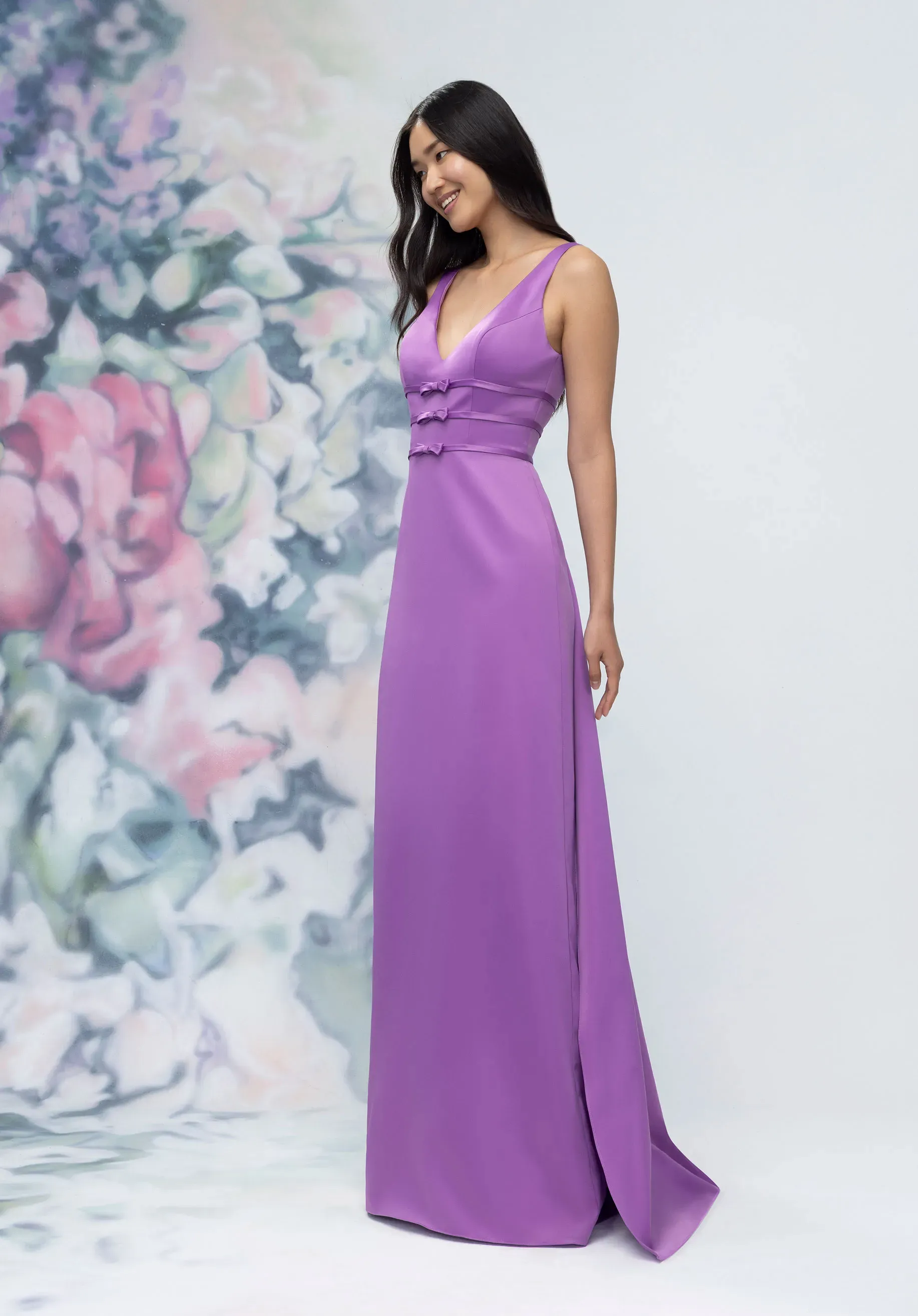 This satin bridesmaid dress features a classic v-neckline that draws the eye down and a triple-banded waist that sculpts the figure. Delicate bow details add a feminine flair with an open square back where understand glamour meets dainty detail. A detachable train adds versatile drama for a look that's unforgettable.